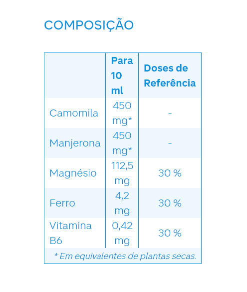 Lista de ingredientes: Água filtrada, xarope de agave* (Agave tequilana Weber), açúcares de uva** (Vitis vinifera L.), citrato-malato de magnésio, extractos de camomila**(Matricaria chamomilla L.) e manjerona** (Origanum majorana L.), concentrado de água do mar sem sódio, gluconato de ferro, vitamina B6 (cloridrato de piridoxina), conservante: sorbato de potássio, acidificante: ácido láctico; aroma natural de groselha. *Origem México. **Origem Europa.