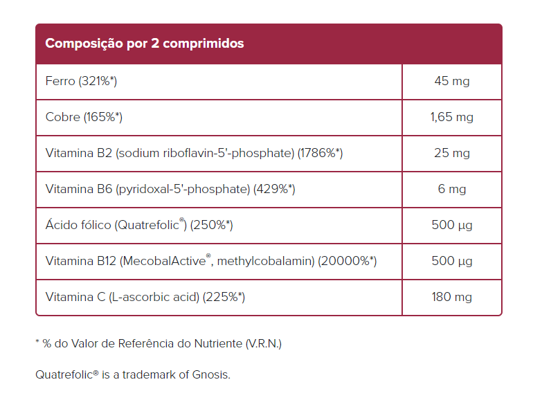 Ingredientes: agente de volume: goma arábica, bisglicinato ferroso, vitamina C, farinha de arroz (Oryza sativa), agente de revestimento: ácidos gordos, vitamina B2, gelificante: hidroxipropilmetilcelulose, bisglicinato cúprico, vitamina B6, emulsionante: glicerol, ácido (6S)-5-metiltetra-hidrofólico: sal de glucosamina, vitamina B12.