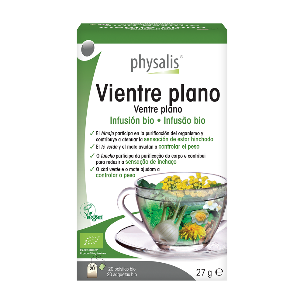 As fermentações intestinais provocadas por uma má digestão geram flatulência, que por sua vez confere uma sensação de inchaço. Physalis Ventre plano infusão de ervas bio contém funcho, que suporta a purificação do corpo e ajuda a reduzir a flatulência e a sensação de barriga inchada. A erva-cidreira, a hortelã e o dente-de leão favorecem a digestão. O chá verde e o mate apoiam a combustão das gorduras e, participam assim no controle do peso. Sabor suave e agradável.